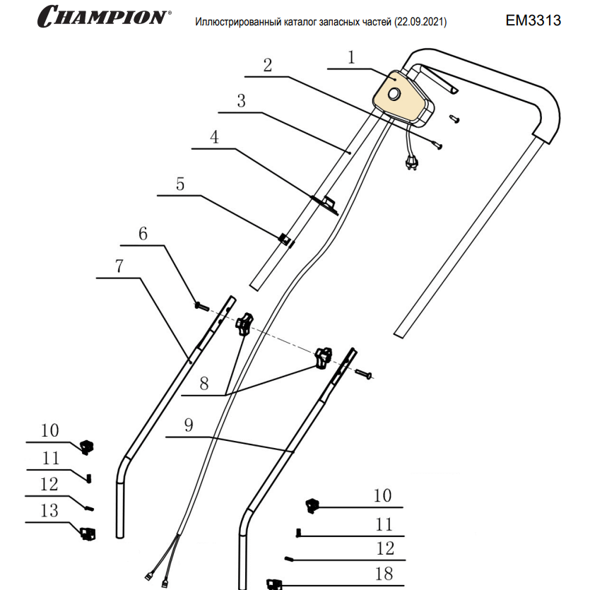 1 | РУЧКА - ВЫКЛЮЧАТЕЛЬ | Запчасти для газонокосилки чемпион ЕМ3313 | обновлена с 22.09.2021 года | Сервис - Магазин |